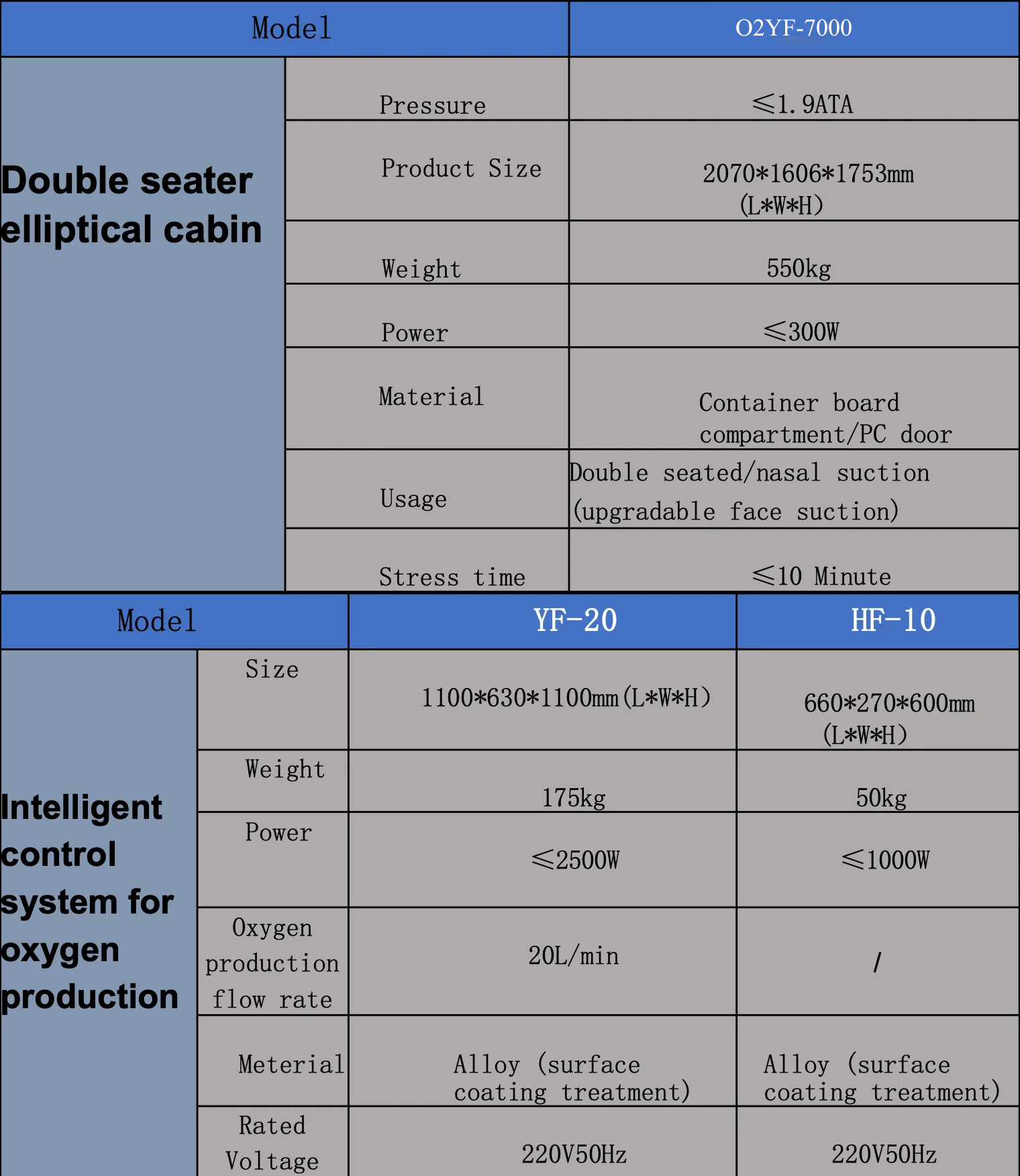 2.0ATA operating pressure,Versatile, comfortable, practical, advanced design,Ideal model designed for 1-3 users at the same time. O2YF-7000 multiplace hyperbaric oxygen chamber stands as an advanced and professionally designed pressurized enclosure tailored for delivering hyperbaric oxygen therapy (HBOT). This spacious chamber is engineered to comfortably accommodate a group ranging from 1 to 3 individuals at once, making it an ideal choice for commercial settings, also you can share thehyperbaricchamber healing journey with your friends, family, or other users.